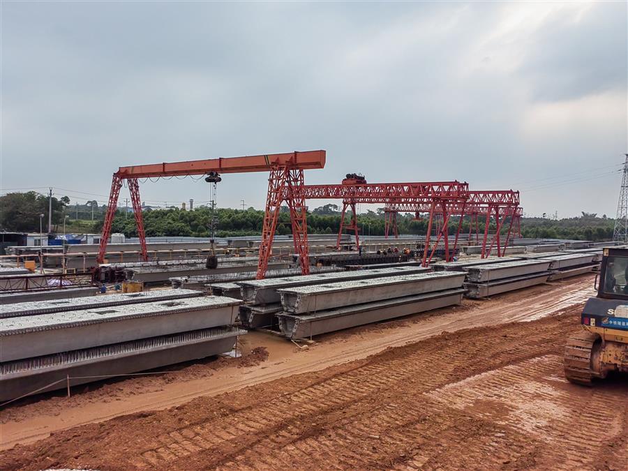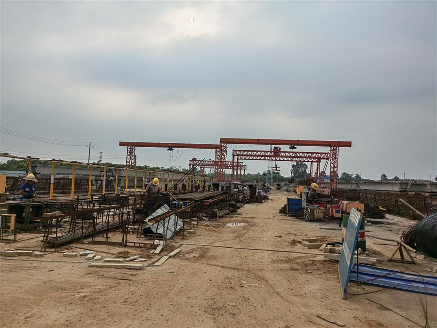 在施工現(xiàn)場,20多臺大型設備在不同時段連續(xù)配合作業(yè),運輸車輛有序進行運土填筑路基、材料進出場,100多名項目管理人員及工人分為預制梁場、樁基施工、橋梁下部結構等班組全線鋪開,在各個作業(yè)點上有條不紊地開展施工作業(yè)。