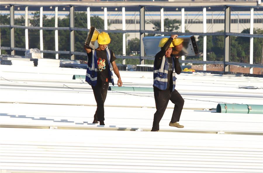 7月25日清晨,在廣西柳州柳工集團柳工裝載機燈塔工廠項目工地,工人在屋面施工。