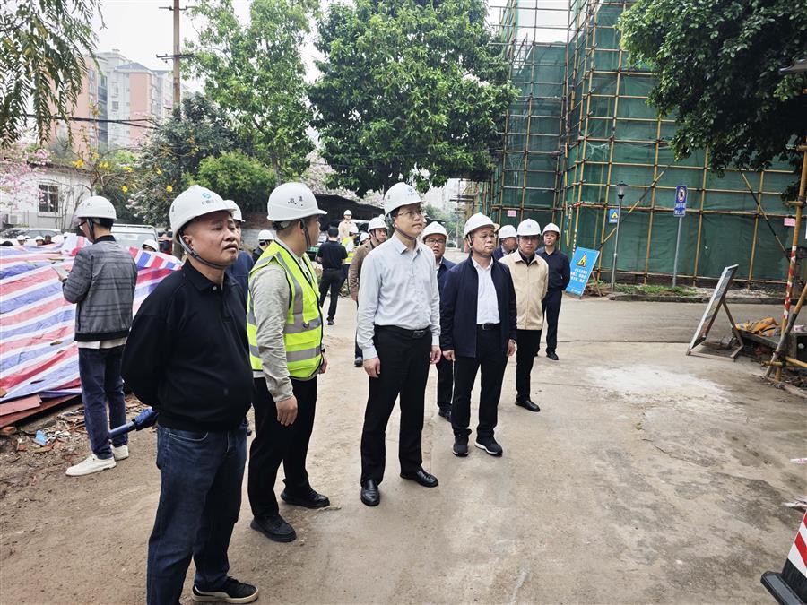 石中華一行深入施工現(xiàn)場(chǎng)了解項(xiàng)目進(jìn)展情況,詳細(xì)了解項(xiàng)目建設(shè)規(guī)模、施工進(jìn)度、安全生產(chǎn)及質(zhì)量管控等情況。在聽(tīng)取匯報(bào)后,石中華對(duì)項(xiàng)目前期工作成效給予充分肯定,并就項(xiàng)目當(dāng)前推進(jìn)過(guò)程中存在的困難與問(wèn)題提出具體指導(dǎo)意見(jiàn)。他指出,該項(xiàng)目是柳北區(qū)落實(shí)城市更新行動(dòng)、改善老舊小區(qū)居住品質(zhì)的重點(diǎn)民生工程,承載著周邊居民對(duì) “安居夢(mèng)” 的殷切期盼。他要求,施工單位要提高政治站位,強(qiáng)化責(zé)任擔(dān)當(dāng),嚴(yán)格落實(shí)安全生產(chǎn)主體責(zé)任,緊盯施工安全與工程質(zhì)量雙底線,搶抓施工黃金期,倒排工期、掛圖作戰(zhàn),確保項(xiàng)目按 180 日歷天工期高效推進(jìn),讓居民早日實(shí)現(xiàn)安居宜居。他強(qiáng)調(diào),當(dāng)前正值春季施工關(guān)鍵期,要統(tǒng)籌做好施工組織與現(xiàn)場(chǎng)管理,優(yōu)化施工方案,加強(qiáng)項(xiàng)目標(biāo)準(zhǔn)化規(guī)范化建設(shè),全力推動(dòng)項(xiàng)目提質(zhì)提速增效,柳北區(qū)區(qū)委、區(qū)政府也將全力給予項(xiàng)目支持保障。同時(shí),要始終把群眾利益放在首位,加強(qiáng)與街道、社區(qū)、居民的溝通聯(lián)動(dòng),及時(shí)回應(yīng)群眾訴求,做好施工期間的便民服務(wù)與環(huán)境保障,爭(zhēng)取群眾最大理解與支持。
