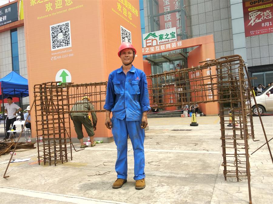 8月31日,在柳州家居建材博覽中心室外廣場上,一群頭戴安全,身著工裝的農(nóng)民工在各自忙碌著,不時(shí)傳來“叮叮?!变摻钆鲎猜?、“嘩嘩嘩”刨木聲、“咚咚咚”敲磚聲……伴隨著一片熱鬧的聲響,柳州市第四屆農(nóng)民工技能大賽暨柳州市第三屆農(nóng)民工家庭服務(wù)業(yè)大賽火熱舉行。
