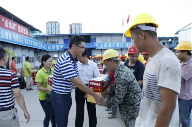 柳州市高新區(qū)科技園專家公寓樓工程由我司桂華分公司承建。8月7日下午,廣西建工集團副總經(jīng)理侯立林冒著高溫酷暑,專程從南寧前來項目建設(shè)現(xiàn)場給一線職工和農(nóng)民工“送清涼”,公司領(lǐng)導歐志永、賴海標、廖立波參加活動。130多份價值9000多元的慰問品,在十多分鐘的時間里,全部發(fā)放完畢。